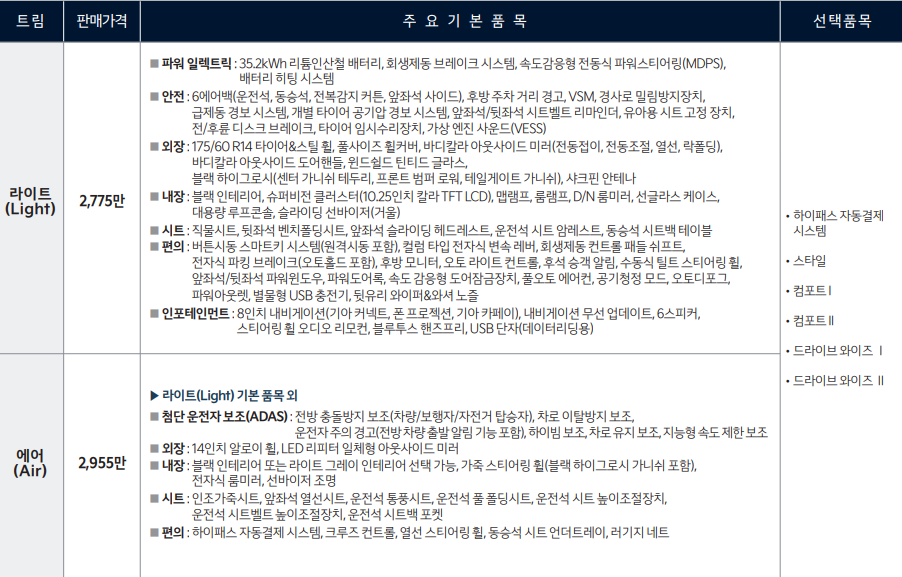 레이 EV가 지난달 8월 24일부터 사전예약을 시작하여 9월 10월중 레이 EV를 출고하는 고객 300명을 대상으로 비상용 완속 충전 케이블 할인 쿠폰을 제공하는 이벤트를 진행 중입니다. 인증 복합 주행거리는 205km, 환경부 인증 복합 주행거리는 210km로 1세대 레이 EV 주행거리(91km) 대비 무려 120km 정도 늘어났습니다. 레이 EV는 기아 전기차 역사상 처음으로 리튬인산철(LFP) 배터리가 장착되었고 배터리 용량은 35.2 kWh입니다. 레이 ev 가격은 2,775만 원부터 시작합니다.