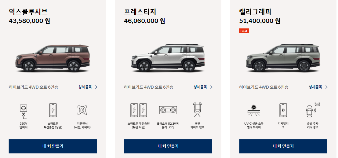 4륜 6인승 익스클루시브 43,580,000 , 프레스티지 46,060,000 , 캘리그래피 51,400,000입니다.