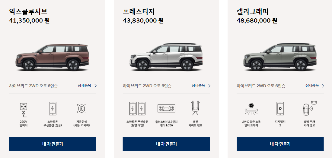 4륜 7인승 익스클루시브 43,230,000 , 프레스티지 45,710,000 , 캘리그래피 51,050,000입니다.