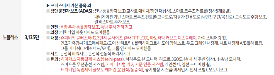두번째 트림인 노블레스 트림 가격은 3,135만 원입니다. 노블레스 트림부터 서라운드뷰 옵션이 기본으로 들어갑니다.