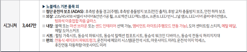 가장 상위 트림 시그니처 가격은 3,447만 원입니다. 엠비언트 라이트가 추가되어 더욱 고급진 차량이 되는 시그니처 트림입니다. 외장재도 다 LED로 바뀝니다. 자세한 사항은 카탈로그를 참고하시면 됩니다.