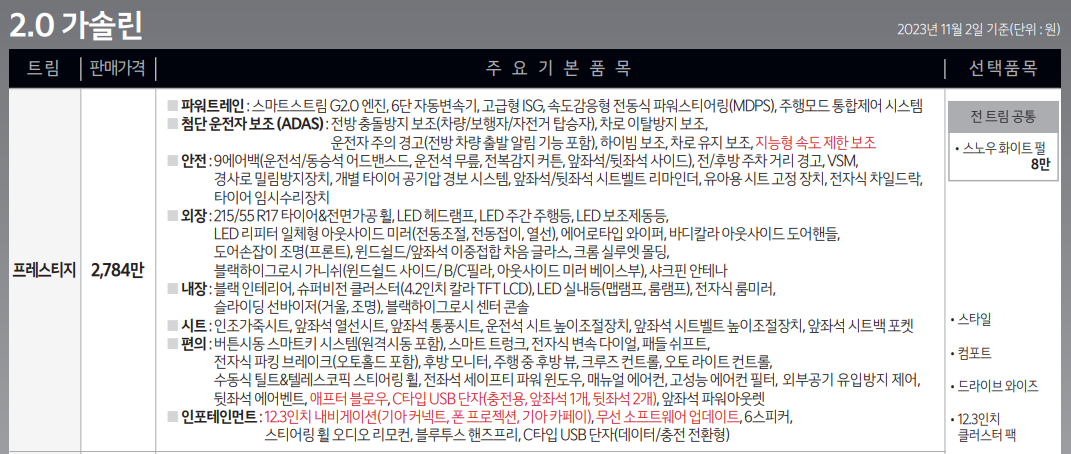 최하위 트림인 프레스티지 가격은 2,784만 원입니다. 기존에 한 단계 낮은 트림은 트렌디 트림이 삭제되고 프레스티지 트림에 기본옵션들이 추가되면서 가격인상은 되었지만 가성비가 더 좋아진 상황입니다.