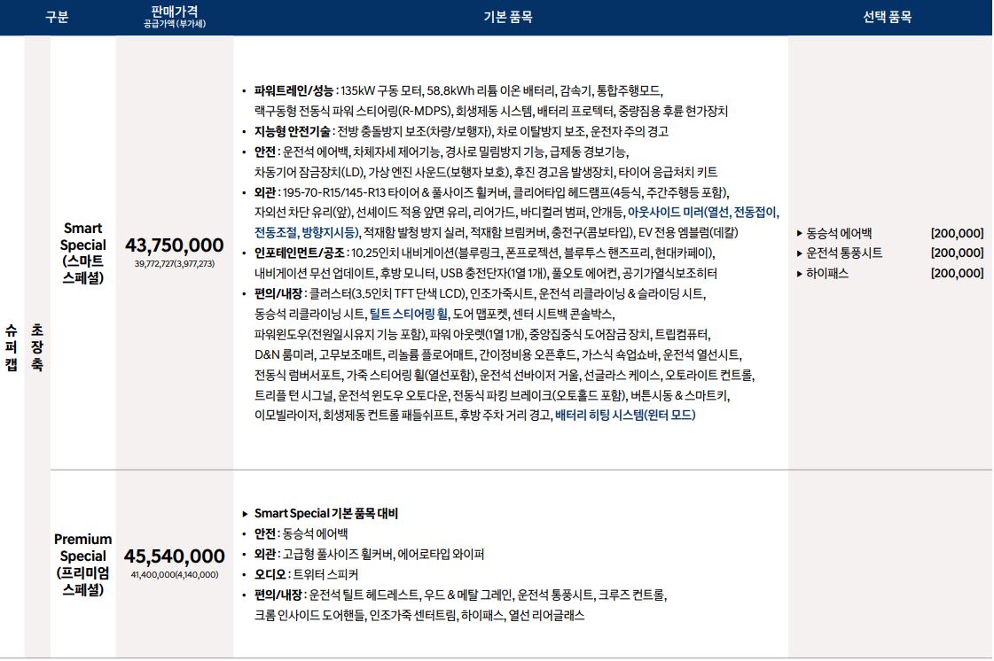포터 2 전기차 가격 스마트 스페셜, 프리미엄 스페셜