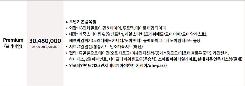 프리미엄 트림가격은 30,480,000입니다. 1열 열선, 통풍시트가 기본으로 들어가고 전동 트렁크가 필요하신 분은 꼭 프리미엄 트림을 선택하시길 바랍니다. 운전석 및 동승성 파워 윈도가 들어갑니다.
