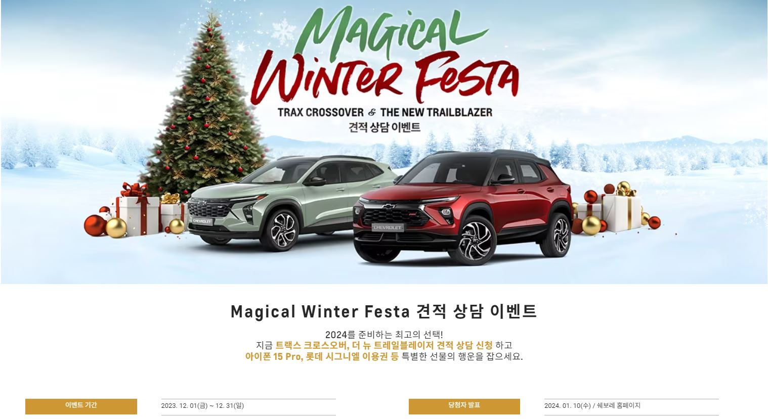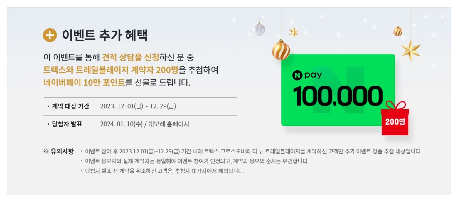 쉐보레가 연말을 앞두고 공격적인 이벤트를 진행 중입니다. 트랙스오버, 더 뉴 트레일블레이저 견적만 내도 아이폰 15 pro, 롯데 시그니엘 이용권 등 특별한 선물을 지급하니 지금 바로 참여해보세요.