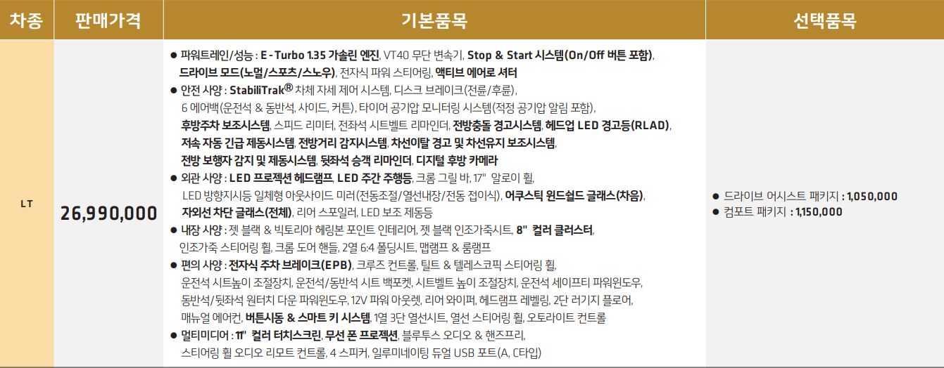 가장 하위 트림인 LT 가격은 26,990,000입니다.