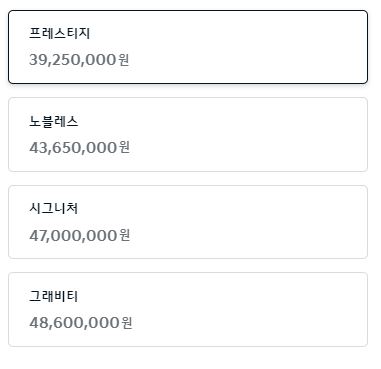 9인승 트림별 가격입니다. 최하위 트림인 프레스티지 3,925만원 노블레스 4,365만원 시그니처 4,700만원 그래비티 4,860만원 입니다.