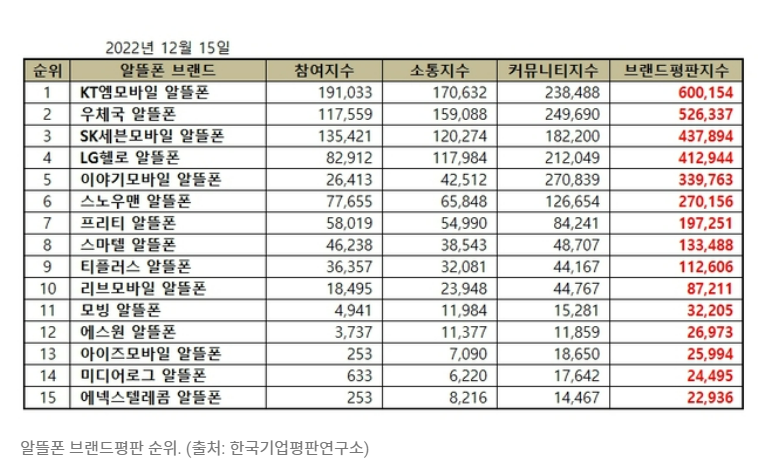 알뜰폰 브랜드 평판자료:  알뜰폰 요금제 선택하실 때 참고하시기 바랍니다.
