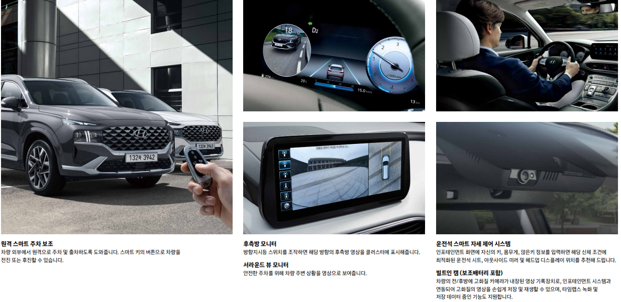 차량이 5m가 가까이 되다 보니 주차에 어려움을 겪는 분들이 계실 텐데요 하지만 걱정하실 필요가 없습니다. 개인적으로 혁신적인 옵션이다라고 생각하는 옵션 중 하나가 어라운드뷰인데요 후측방뿐 아니라 차체의 움직임자체를 보여주니 주차하는데 훨씬 수월한 기능입니다. 거기다가 지어진 지 오래된 건물을 가게 되면 주차간격이 좁은 경우를 많이 보게 되는데 차량을 주차선에다만 맞춰 놓고 운전자와 동승자는 내린 후 리모컨 만으로 차량을 앞뒤로 뺐다 넣었다 할 수가 있습니다.