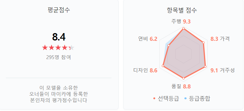 실제로 싼타페를 구매하여 운행하고 있는 분들의 솔직한 차량 평가입니다. 8.4면 높은 편이고 디자인면에 있어서도 다들 만족하는 편입니다.