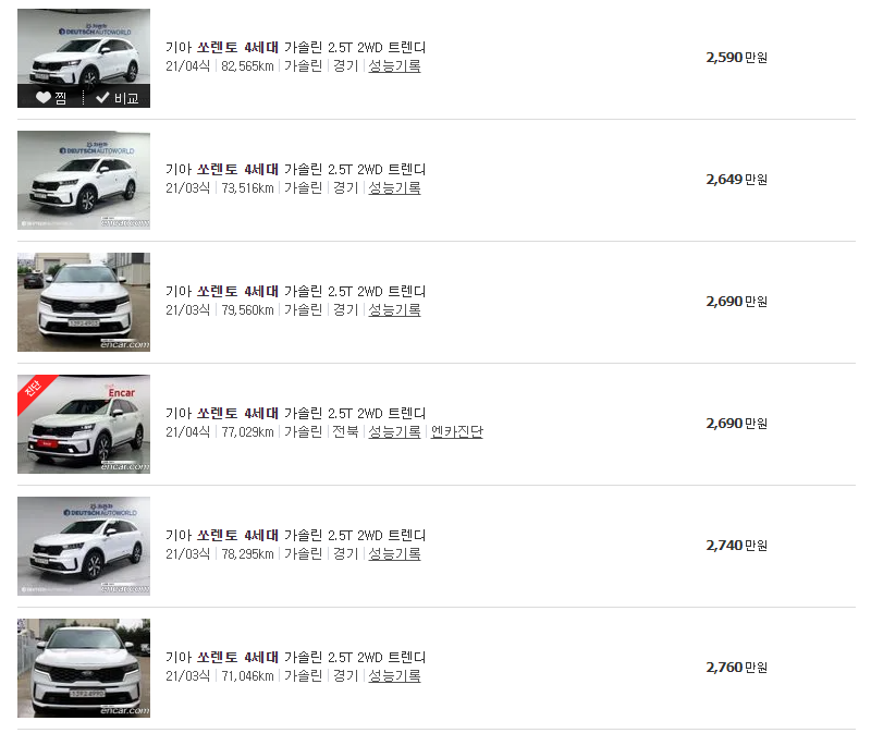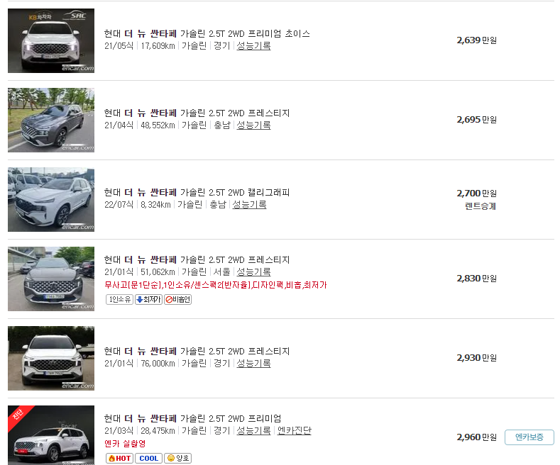 쏘렌토 싼타페 두 차량다 가장 낮은 가격순으로 나열을 한 건데요 싼타페 쏘렌토 둘 다 가장 낮은 가격이 2600만원 선인걸 확인하셨을 겁니다. 뭐야? 가격대가 비슷하네라고 생각하실 수 있는데 쏘렌토는 키로수 7만km대 가장 하위 트림인 트렌디가격이고 싼타페는 키로수 5만 km 대 두 번째 트림인 프레스티지 차량이 대다수이니 가성비로는 싼타페가 압승이라고 볼 수 있습니다.