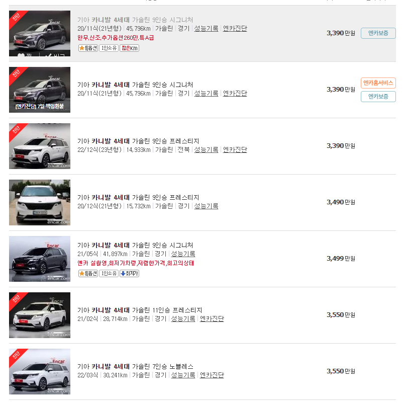 매물이 많은 엔카 기준으로 km수가 너무 많지 않고 적당한 옵션들(후방카메라, 열선, 통풍 등)이 들어가 있는 차량의 시작가는 3천 중반 때에 형성되어 있습니다. 개인적으로 이 정도 가격이면 나쁘지 않은 가격대라고 생각합니다.