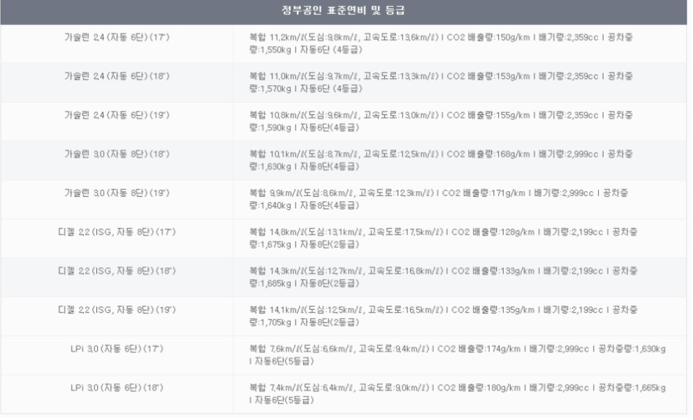 그랜저ig 제원 및 연비