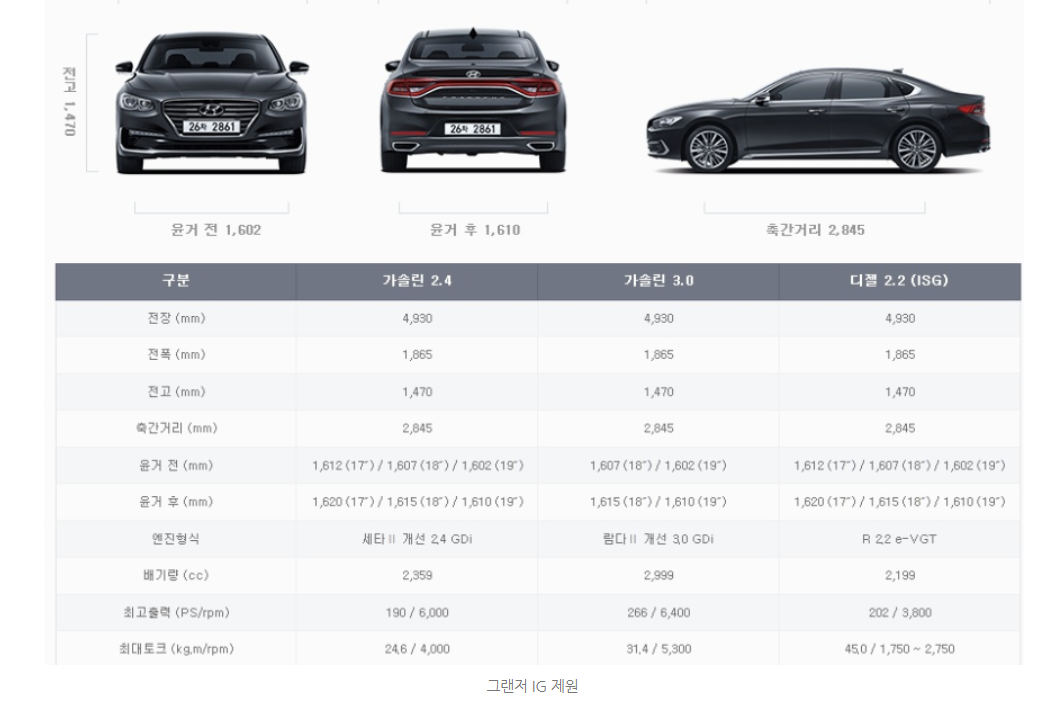 그랜저ig 제원입니다. 준대형 세 단답게 뒷좌석이 넓은 편입니다.