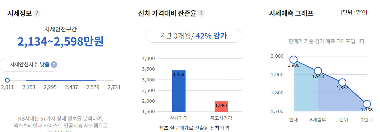 차량을 조회 해보시면 1800만 원대 가격대부터 나오는데 실질적으로 키로수가 20만에 가까운 차량들이 많아서 2000~2400 선에서 보시는 게 안전할 거 같습니다.