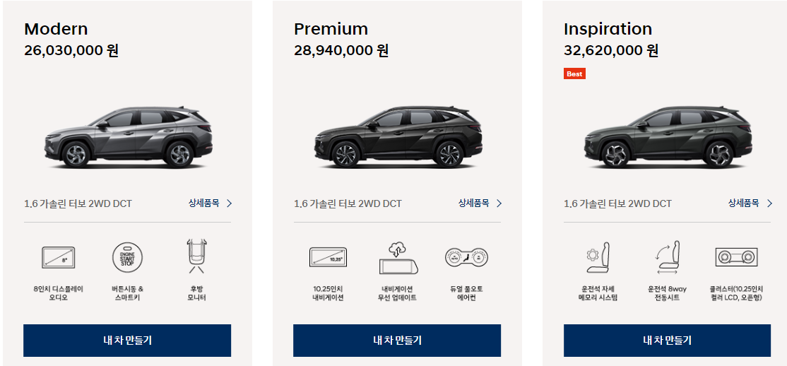 투싼은 중고차로 구매시 신차로 구매할때 보다 더 메리트 있는 차량인데요 대부분 중고차량이 그렇지만 투싼 같은 경우 2020~2021년식에 5만키로도 안되는 인스퍼레이션 차량이 신차 모던 트림보다 저렴한 매물들이 많아서 구매를 원하시면 지금이 적기라고 생각합니다.